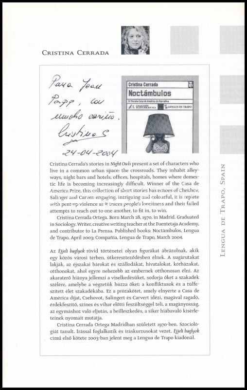 Description: Európai elsőkönyvesek fesztiváljának könyve autográf aláírásokkal Marco Fabio Appoloni, Cristina Cerrada, GErard Donovan, Lavinia Greenlaw, Maria Gronlykke, Jan Lavwereyns, Ulla Lenze