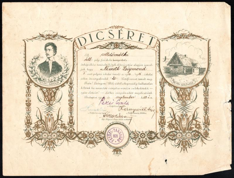 1931 Bp., Petőfi-Társaság emléklapja, Pekár Gyula, Havas István, Lampérth Géza aláírásával, szakadásokkal