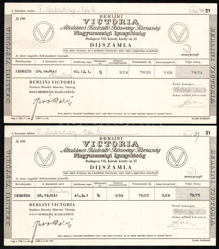 1940-1941 A Berlini Victoria Általános Biztosító Részvénytársaság 2 db díjszámlája