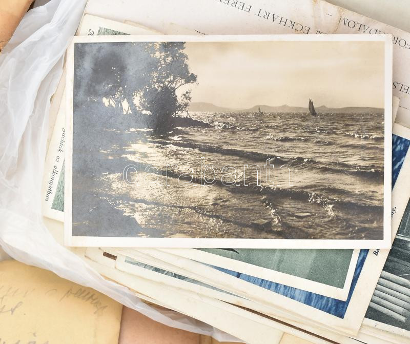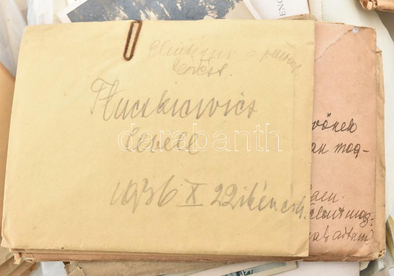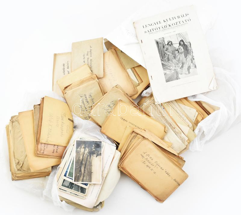 Dr. Marosséllyei Kacsóh Pongrác (1873-1923) zeneszerző, zenepedagógus papírhagyatékából 5 db-os tétel (két fotó, képeslap, meghívó, ex libris): 1904 Bp., Kacsóh Pongrác ("Gráczi mester") dolgozószobájában, ahol a János Vitéz daljáték zenéjét szerezte, keményhátú fotó, hátoldalán feliratozva, kissé foltos, 12x9 cm + Kacsóh Pongrác és felesége, Nagy Marianna Ilona, fotó, 7,5x5,5 cm + 1911 Kolozsvár, Kacsóh Pongrác feleségének, Mariskának címzett képeslap + Herceg Esterházy Antal Miklósné meghívója Kacsóh Pongrác részére, az Operaházban tartandó díszelőadás utáni vacsorára + Ex libris Pancratii de Kacsoh, apró szakadásokkal, 9,5x12 cm