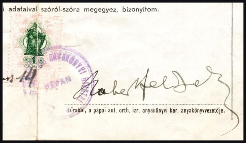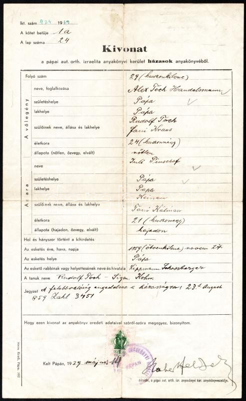 1939 Házassági anyakönyvi kivonat egy 1859-ben kötött házasságról, főrabbi aláírásával, okmánybélyeggel, hajtott