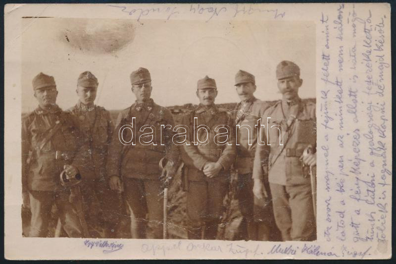 Description: 1917 Szili István tüzér, a K.u.K. Feldhaubitzeregiment 32. Batterie 5. (tábori ágyútarackos tüzérezred) katonája társaival az orosz fronton; megírt tábori posta levelezőlap, bélyegzőkkel, 14x9 cm