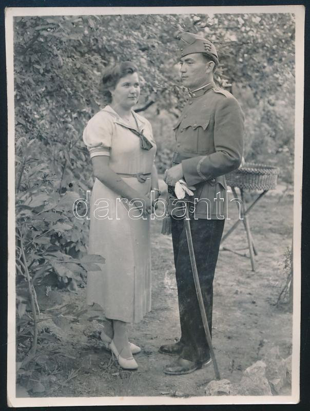 1938 Katona kedvesével, egyenruhában, bocskai sapkával, karddal; fotó,...