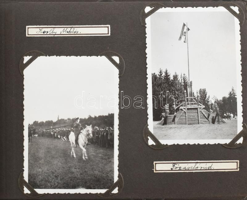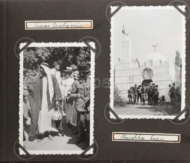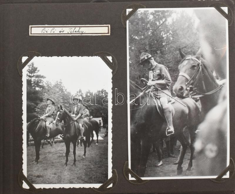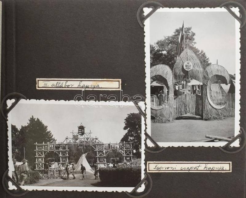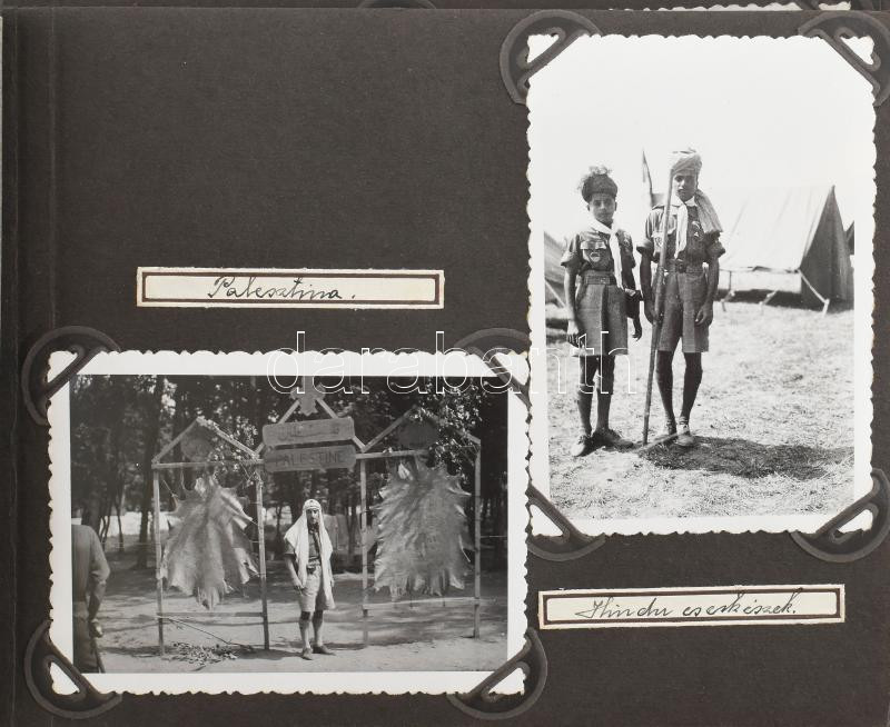 1933 Gödöllő, Jamboree, fotóalbum 40 db fotóval a cserkész táborról, annak életéről, a csapatok sátrairól, közte: Horthy Miklós üdvözli a tábor lakóit, amerikai, finn, szír, stb. csapatok sátrai, japán csapat felvonulása, vitorlázó repülőgép, stb., 6,5×8,5 cm