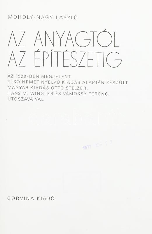Moholy-Nagy László: A anyagtól az építészetig. Az 1929-ben megjelent e... https://www.darabanth.com/en/432-Online-auction/432.0/Books/Books-Architecture-Art~1000018/Moholy-Nagy-Laszlo-A-anyagtol-az-epiteszetig-Az-1929-ben-megjelent-elso-nemet-nyelvu-kiad~II2781842