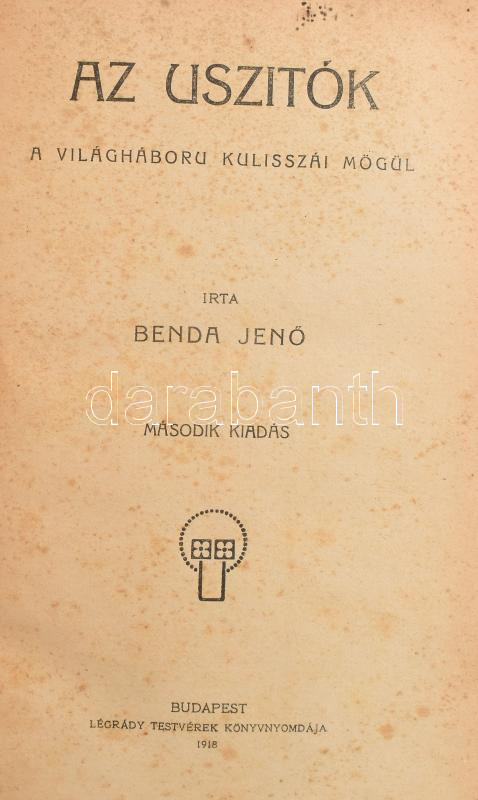 Benda Jenő: Az uszítók. A világháború kulisszái mögül. Bp., 1918., Lég... https://www.darabanth.com/en/432-Online-auction/432.0/Books/Books-History~1000010/Benda-Jeno-Az-uszitok-A-vilaghaboru-kulisszai-mogul-Bp-1918-Legrady-Masodik-kiad~II2784209