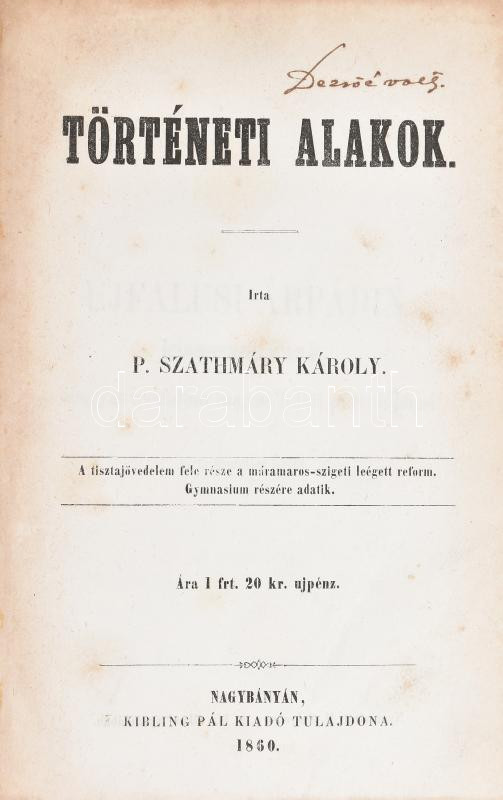 P. Szathmáry Károly: Történeti alakok. Nagybánya, 1860, Kibling Pál, 8+191+1 p. Átkötött félvászon-kötés.