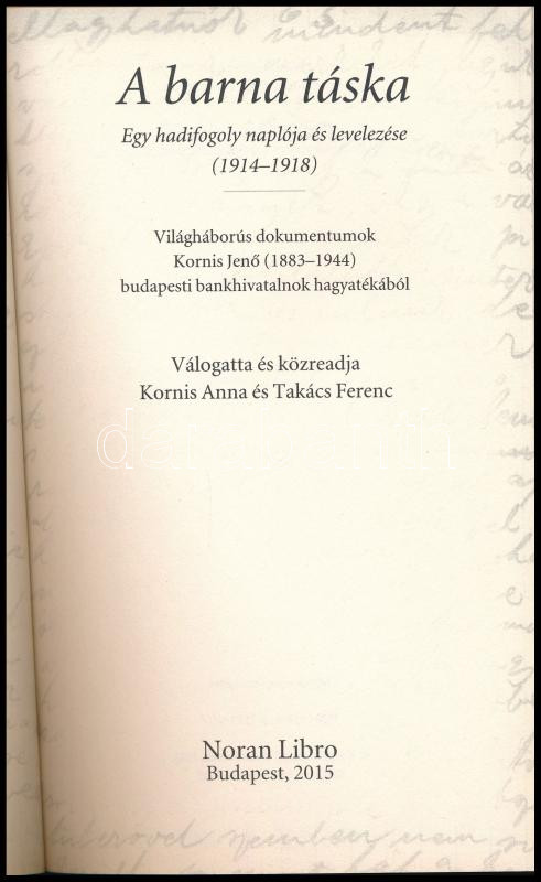 Description: A barna táska. Egy hadifogoly naplója és levelezése 1914-1918. Világháborús dokumentumok Kornis Jenő (1883-1944) budapesti bankhivatalnok hagyatékából. Vál. és közreadja: Kornis Anna és Takács Ferenc. Bp., 2015., Noran Libro. Kiadói papírkötés.
