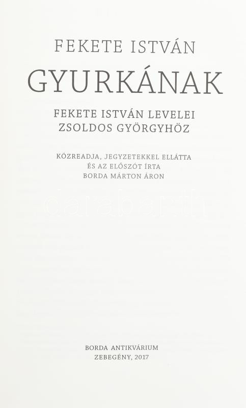 Fekete István: Gyurkának. Fekete István levelei Zsoldos Györgyhöz. Zeb... https://www.darabanth.com/en/432-Online-auction/432.0/Books/Books-Other-rarities~1000037/Fekete-Istvan-Gyurkanak-Fekete-Istvan-levelei-Zsoldos-Gyorgyhoz-Zebegeny-2017-Borda-Antik~II2785147