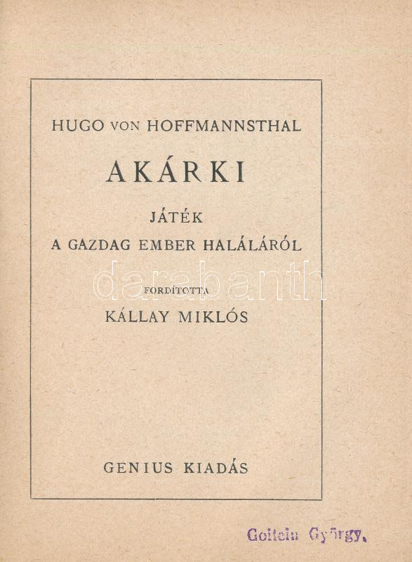 Description: Hofmannsthal, Hugo von: Akárki. Játék a gazdag ember haláláról. Ford. Kállay Miklós. (Bp. 1924.) Genius. 125 l. Kiadói papírkötésben Goiteiu György, a kolozsvári zsidó gim. igazgatójának pecsételt ex librisével
