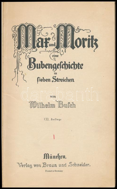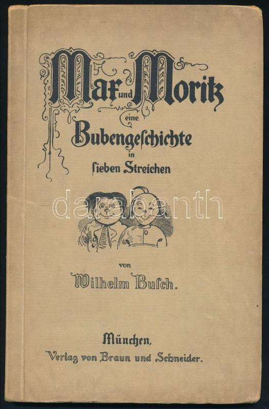 Description: Busch, Wilhelm: Max und Moritz. Eine Bubengeschichte in sieben Streichen. München, é.n., Braun und Schneider, 56 p. Német nyelven. Utólag kézzel kiszínezett illusztrációkkal. Kiadói papírkötés.