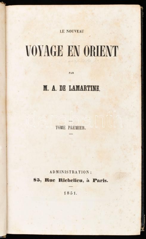 https://www.darabanth.com/en/432-Online-auction/432.0/Books/Books-Travelling-Local-History~1000006/Lamartine-Alphonse-de-Le-Nouveau-voyage-en-Orient-I-Paris-1851-Korabeli-kisse-kopott-papir~II2631156