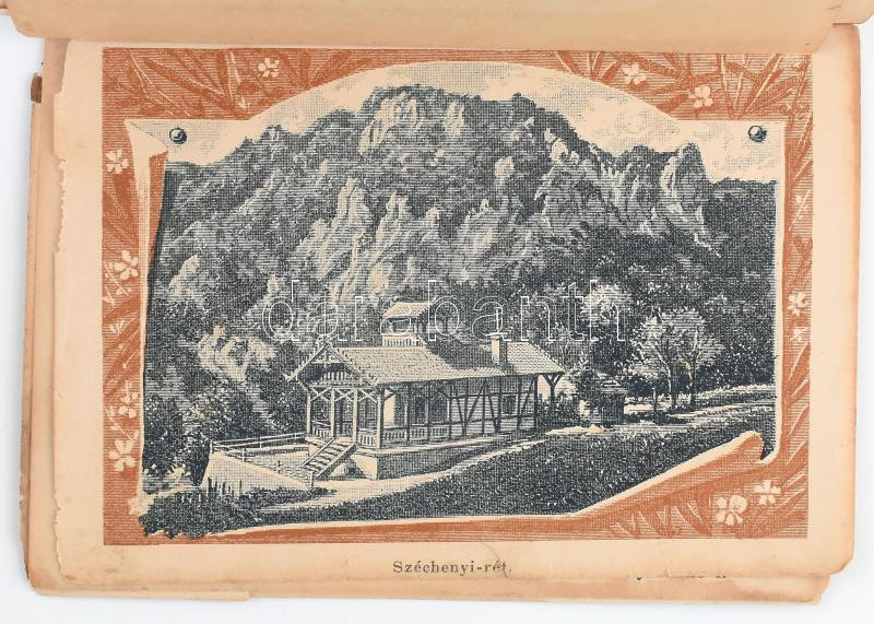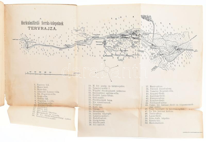 Tatartzy Károly: Herkulesfürdő (Mehádia) gyógyhely Magyarországban. Kivonatosan ismerteti --. Bp. (1888.) Czettel és Deutsch, 34 p.+17 t.+1 (térkép) t. Kiadói illusztrált papírkötés, sérült gerinccel és kötéssel, hiányos, bélyegzésekkel, a címlapon bejegyzésekkel, a kihajtható, a 35 képet tartalmazó leporellókból több kép hiányzik: 18 db, 4 kép elvált a többitől és kijár.