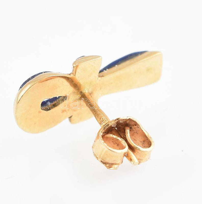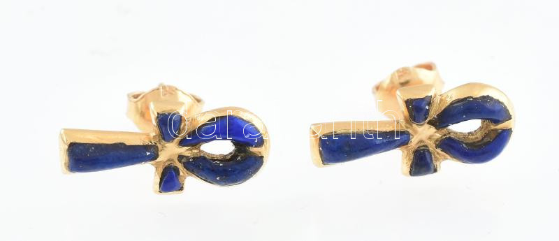 14k arany (Au) és lapis lazuli hatású zománc fülbevaló pár, Ankh kereszt, jelzett br: 2,5 g