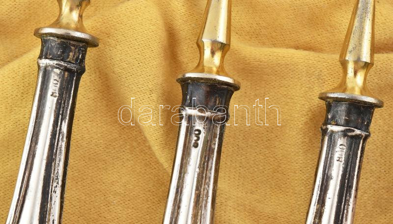 Ezüst (Ag) nyelű, aranyozott acél, gyümölcsös / desszertes evőkészlet, dobozban, jelzett, pár darabon minimális horpadás. Kis kopásokkal. Doboz, sérülésekkel. h: 15-17 cm