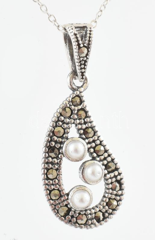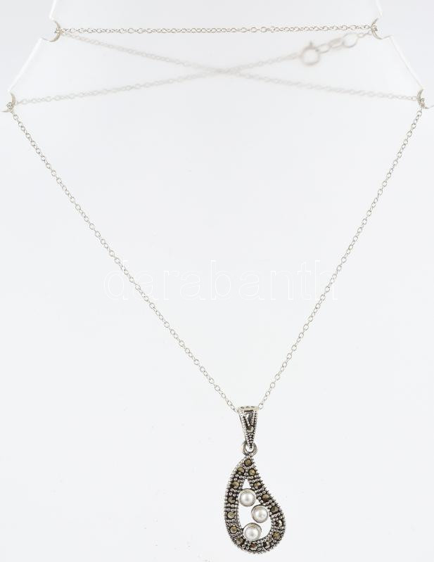 Ezüst(Ag) nyaklánc, markazitos gyöngyös medállal, jelzett, h: 41 cm, bruttó: 3,7 g