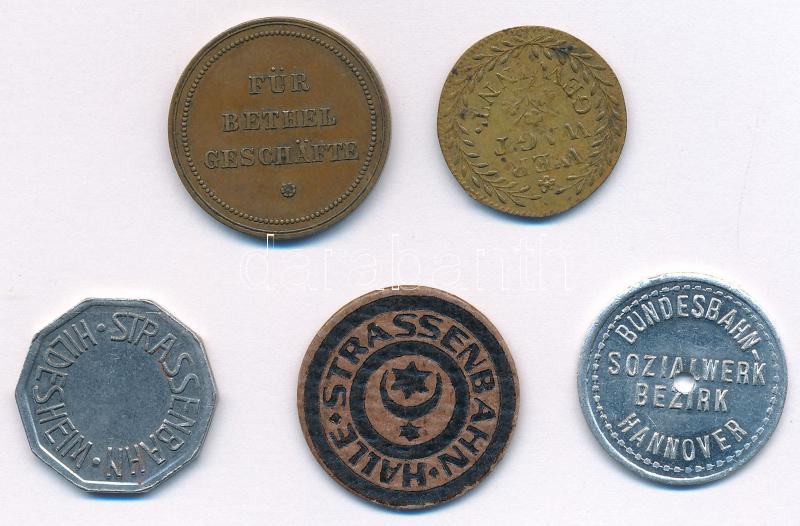 Németország / Weimar Köztársaság / Halle-Hildesheim ~1920. Fe és karton közlekedési (villamos) bárca (2xklf) + Hannover Al közlekedési (vonat) bárca + DN 50pf "Bethel Üzeletek" sárgaréz szükségpénz + DN "Rechen Pfenig / Wer wagt gewinnt" sárgaréz szükségpénz T:2