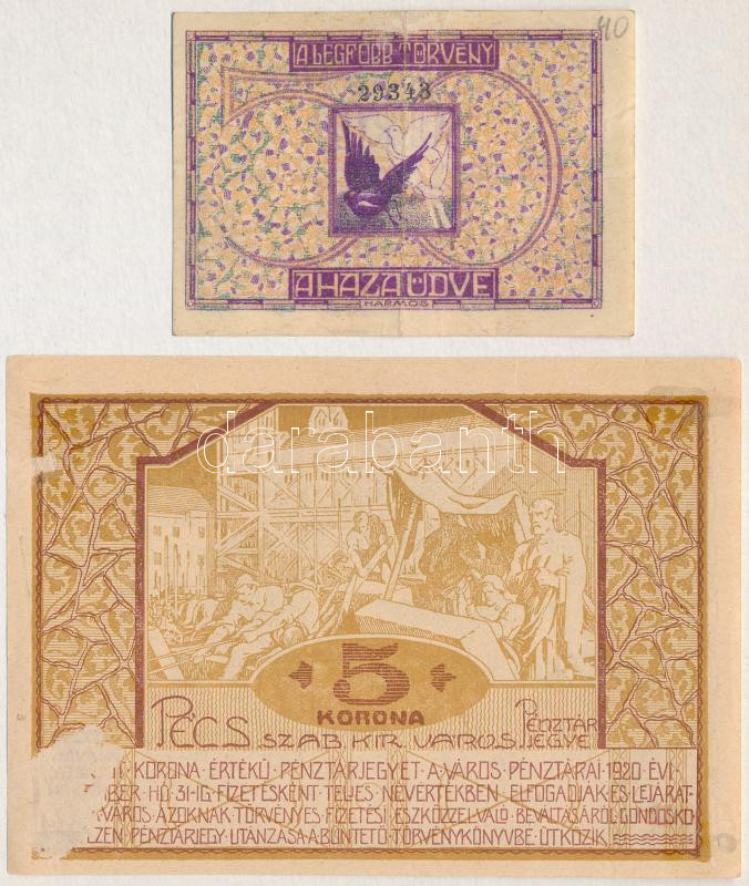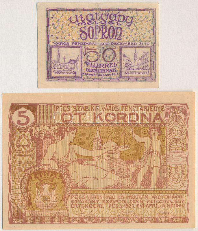 https://www.darabanth.com/en/432-Online-auction/432.0/Numismatics/Emergency-Coins-and-Notes~1500006/Pecs-1920-5K-penztarjegy-plus-Sopron-1919-50f-penztarjegy-TII-III-ragasztonyom-szakadas-~II2779006
