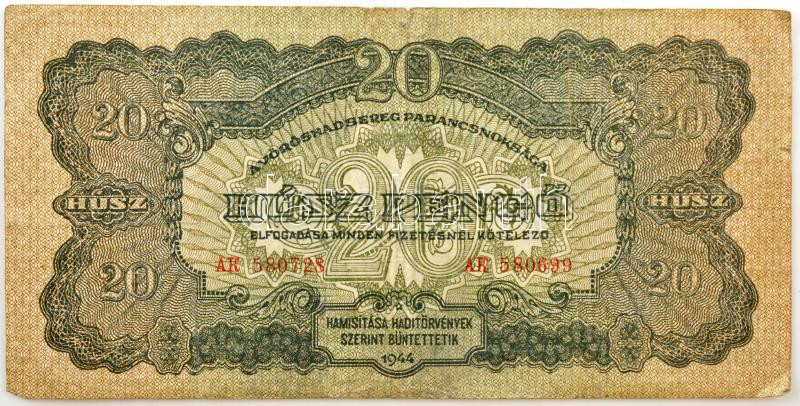 1944. 20P "A Vörös Hadsereg Parancsnoksága", hibás nyomat, eltérő sorszámok: "AK 580728 - AK 580699" T:III