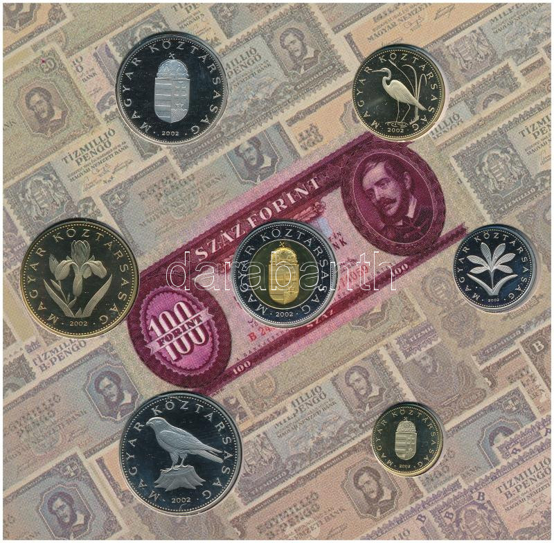 https://www.darabanth.com/en/432-Online-auction/432.0/Numismatics/Hungarian-coins-and-coins-with-Hungarian-mint-marks~1500008/2002-1Ft-100Ft-7xklf-plus-100Ft-Kossuth-forgalmi-sor-szettben-belso-tok-ragasztasa-kisse-eleng~II2786802