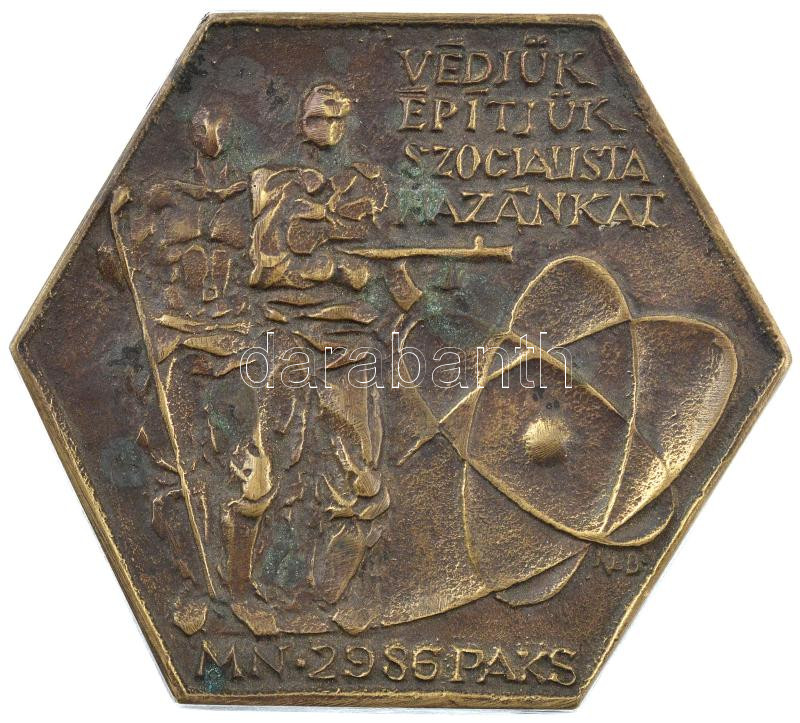 ~1970-1980. "VÉDJÜK ÉPÍTJÜK SZOCIALISTA HAZÁNKAT MN 2986 PAKS" egyoldalas bronz emlékplakett (80x72mm) T:1- patina