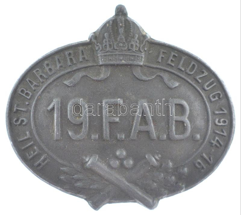 Description: Osztrák-Magyar Monarchia 1916. "19. F.A.B. - Heil St. Barbara - Feldzug 1914-16" A 19. Tábori Tüzér Zászlóalj Zn sapkajelvénye (28x32mm) T:1- / Austro-Hungarian Monarchy "19. F.A.B. - Heil St. Barbara - Feldzug 1914-1916" Zn cap badge of the 19th Field Artillery Battalion (28x32mm) C:AU