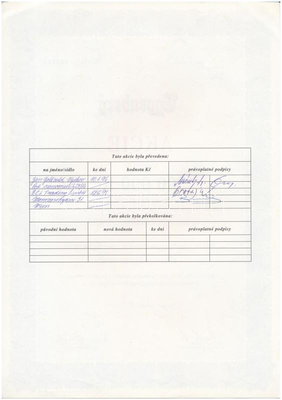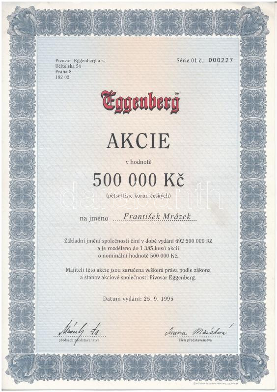 1995 Eggenberg cseh sörgyár részvénye 500 000 K. T: 2-