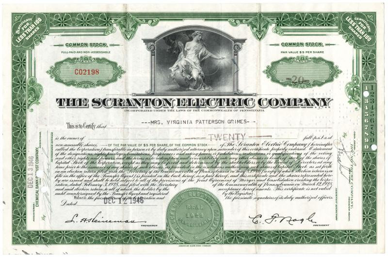 Amerikai Egyesült Államok 1946. "The Scranton Electric Company&qu... https://www.darabanth.com/en/432-Online-auction/432.0/Numismatics/Shares-and-Tickets~1500005/Amerikai-Egyesult-Allamok-1946-The-Scranton-Electric-Company-husz-nevre-szolo-reszvenye-e~II2777661