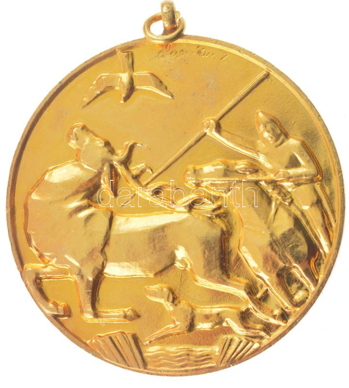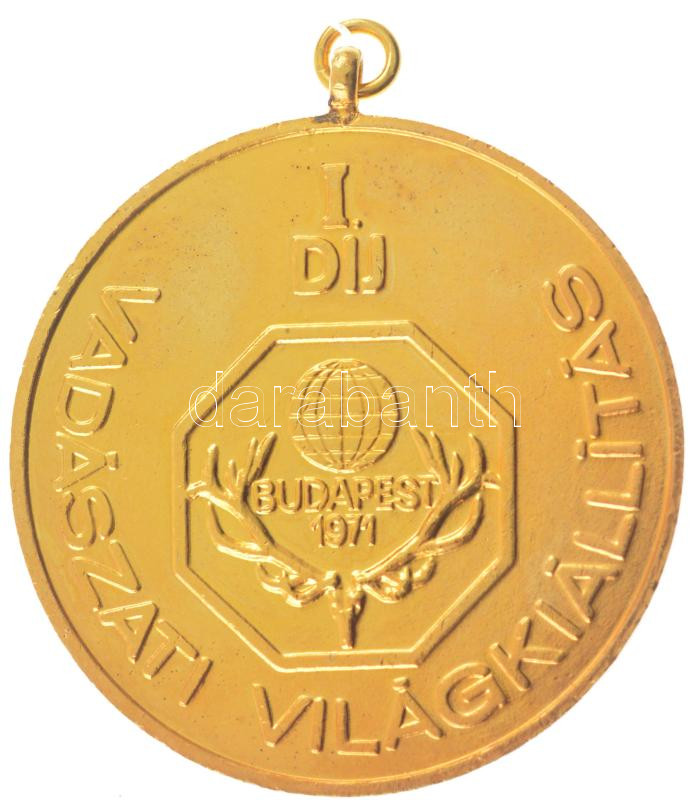 Olcsai Kiss Zoltán (1895-1981) 1971. "Vadászati Világkiállítás I. Díj" kétoldalas aranyozott bronz emlékérem füllel (45mm) T:1,1-