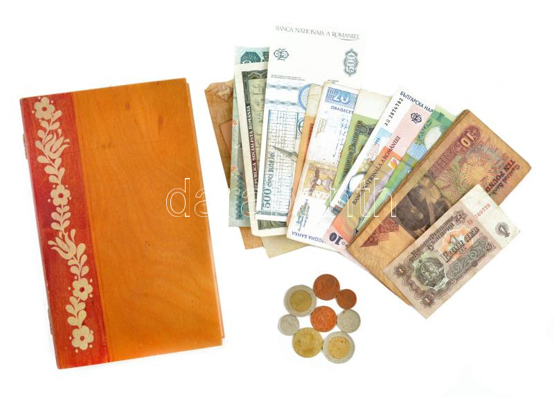 Description: 25 darabos vegyes külföldi érem és bankjegy tétel, közte egyiptomi, román és bolgár bankjegyek festett fadobozban. T:vegyes 25 pieces mixed coin and banknote lot, among egyptian, romanian and bulgarian banknotes in a painted wood box C:mixed