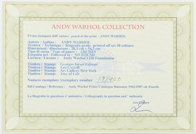 Description: Andy Warhol (1928-1987): Mao Ce Tung / Mao Zedong. Ofszet litográfia, papír. Sorszámozott: 19/100, jelzett a nyomaton. Georges Israel editeur szárazpecséttel is jelzett, tanúsítvánnyal. 36,5x37 cm / Lithography with attest
