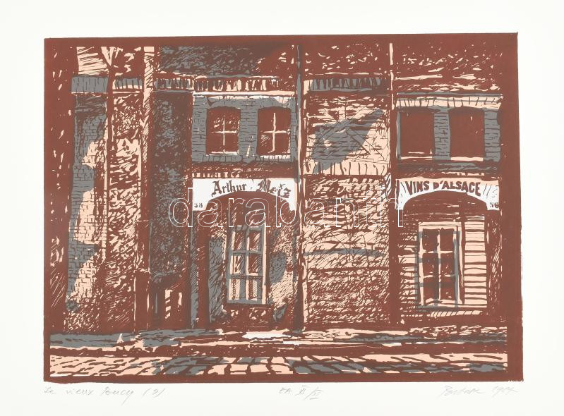 Description: Butak András (1948-2021): Le vieux Bucey, 1987. Szitanyomat, papír, jelzett, művészpéldány EA VI. / XV. számozással. Lapszéli, képet nem érintő törésnyommal. 22,5×32 cm