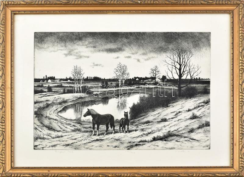 Novák Lajos (1927-1989): Falu télen. Rézkarc, papír, jelzett, számozott (100/23). 29×39 cm. Dekoratív üvegezett fakeretben.