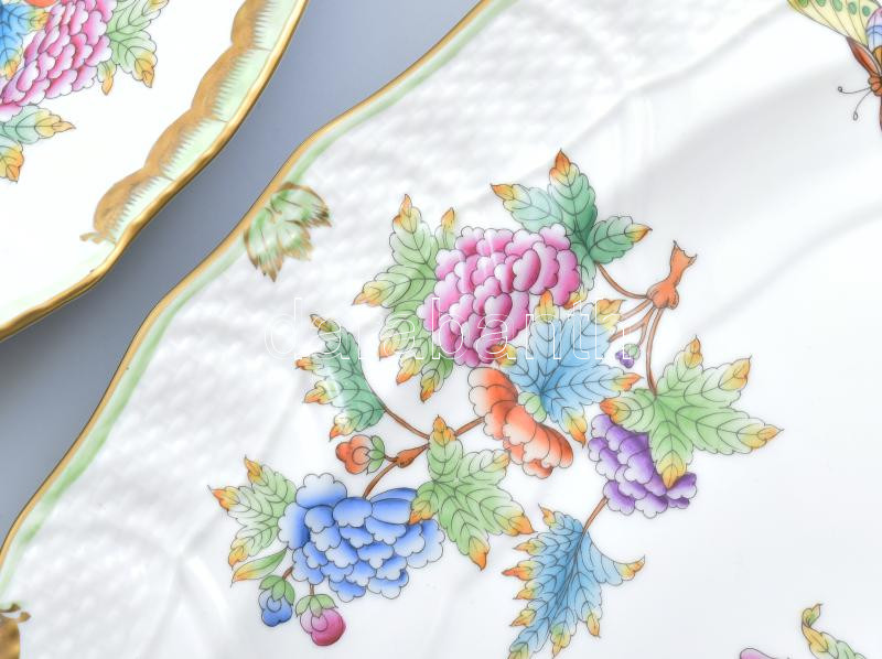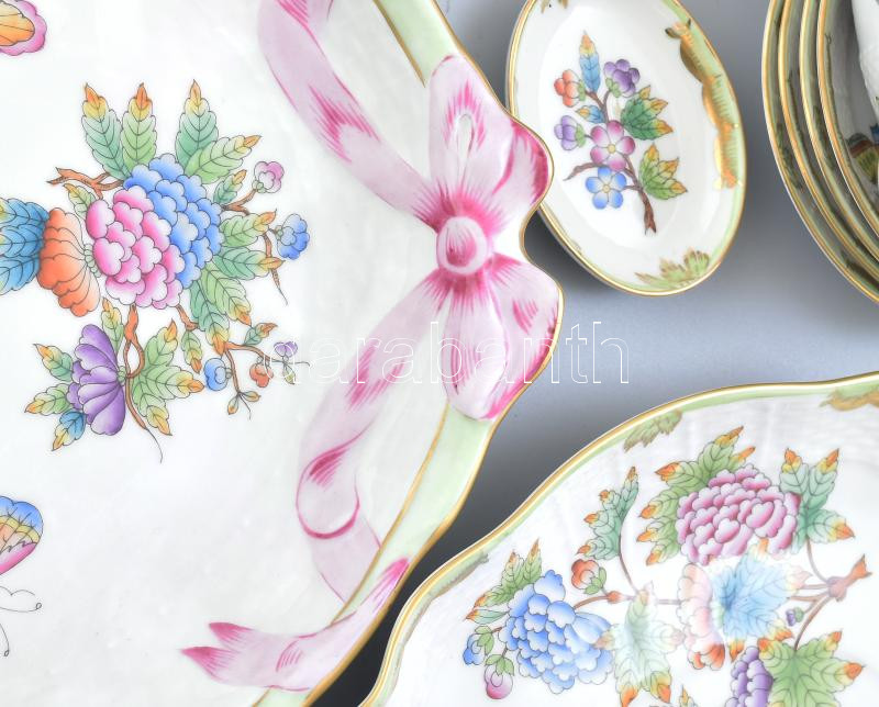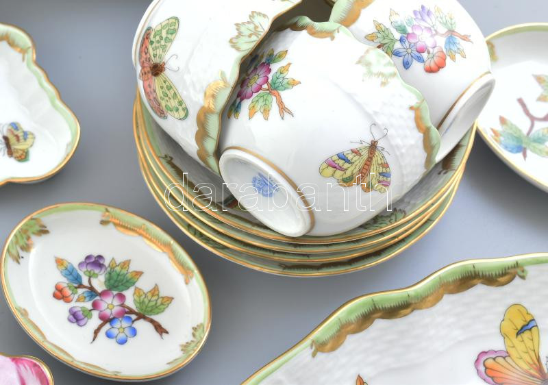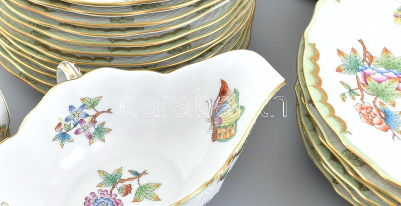 80 részes Herendi Viktória mintás tétel. Kézzel festett porcelán, jelzett, korának megfelelő kopásokkal!!! (12 db mokkás csésze aljjal, 6db mélytányér, 6 db lapos tányér, 12 db süteményes tányér, tálalók: sültes, torta, főzelék, saláta. , tejkiöntő, bonbonier, cukortartó, 6 db leveles tálka, fűszertartó, mokkás tálca és stb.