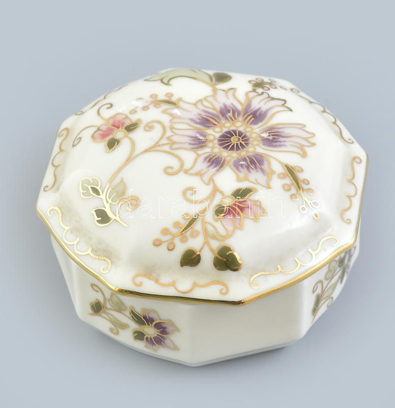 Zsolnay virágmintás bonbonier, belsejében felirat: ,,XXX. Közgazdász -...