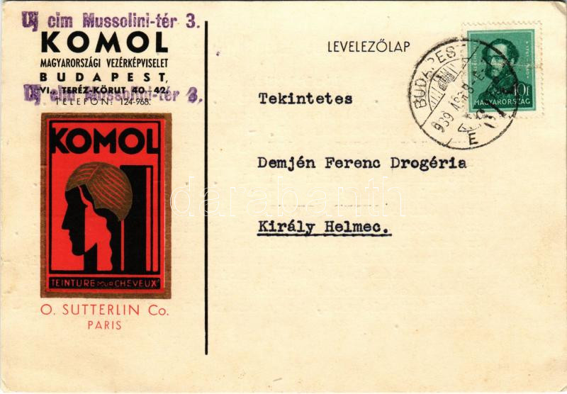 1939 Komol Teinture pour Cheveux O. Sutterlin Co. Paris / Komol Magyarországi Vezérképviselet reklámja. Budapest VI. Teréz körút 40-42. (EK)