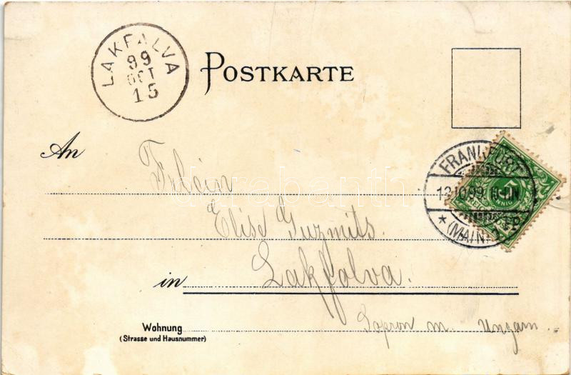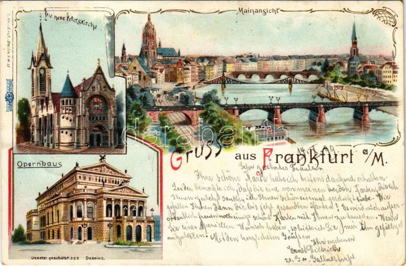 1899 (Vorläufer) Frankfurt am Main, Die neue Peterskirche, Mainansicht, Opernhaus / new church, bridge, operahouse. Art Nouveau, floral, litho (EK)