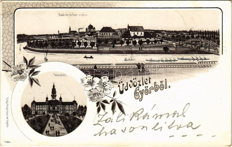 1899 (Vorläufer) Győr, Radó tér, Újváros, Városháza, zsinagóga, híd. Polgár Bertalan kiadása. Art Nouveau, floral, litho