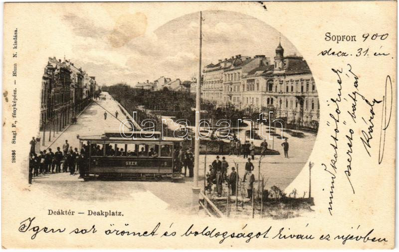 1900 Sopron, Deák tér, villamos. Stagl F. fényképész. Blum N. kiadása (fl)