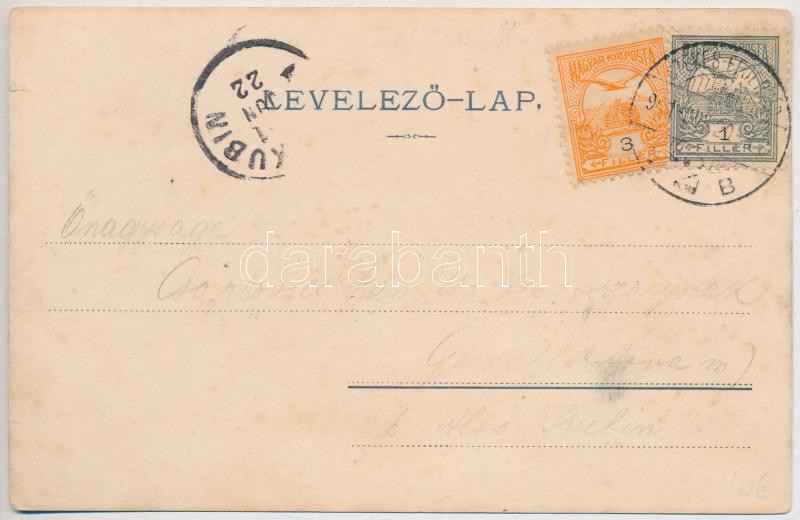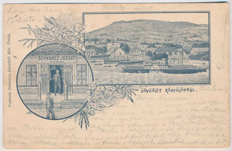 1901 Révfülöp, látkép, kikötő, "KELÉN" gőzös, gőzhajó, Schwarcz József üzlete és saját kiadása. Art Nouveau, floral (kis szakadások / small tears)