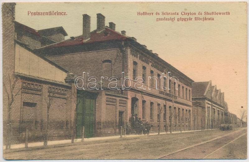 Description: 1920 Budapest XVIII. Pestszentlőrinc, Pusztaszentlőrinc, Szentlőrinc; Hofherr-Schrantz-Clayton-Shuttleworth gazdasági gépgyár főbejárata. Holub Tamás kiadása (ázott / wet damage)