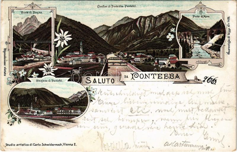 Description: 1897 (Vorläufer!) Pontebba, Ponte di Dogna, Confine di Pontebba-Pontafel, Ponte di Muro, Stazione di Pontafel / bridges, railway station. Carlo Schwidernoch No. 1429. Art Nouveau, floral, litho (EB)