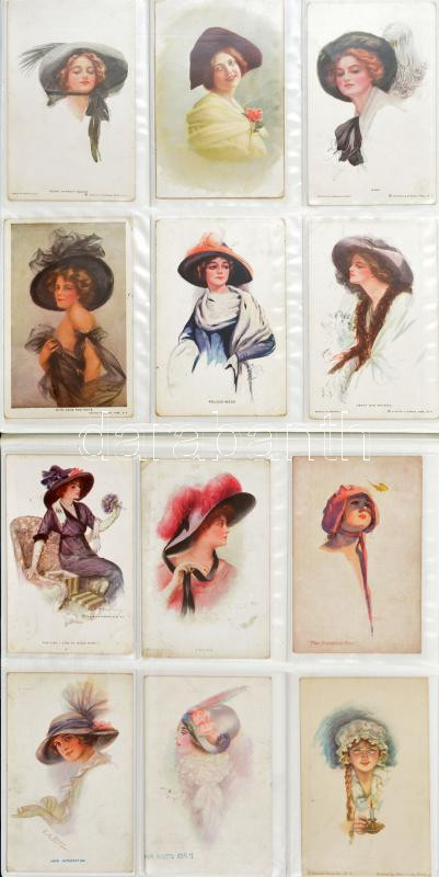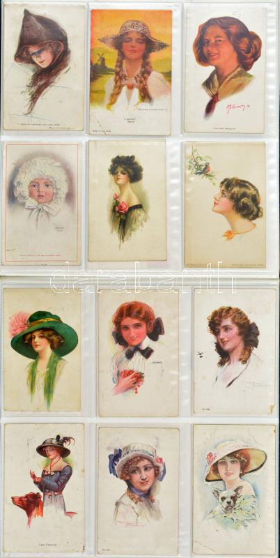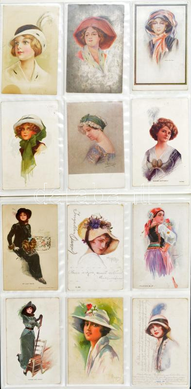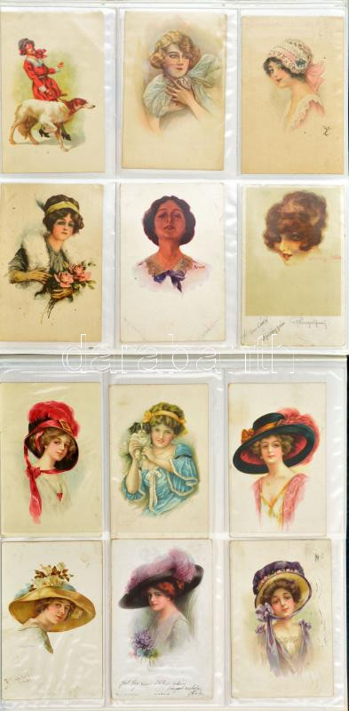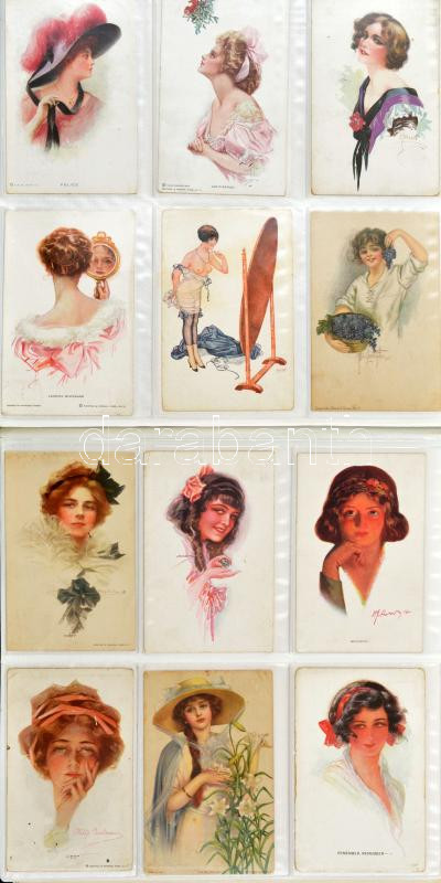 115 db nagyrészt szignós művészlap : hölgyek, párok, divat, ragyogás, albumban / 115 mostly artist signed cards, ladies, couples, fashion, glamour, in album