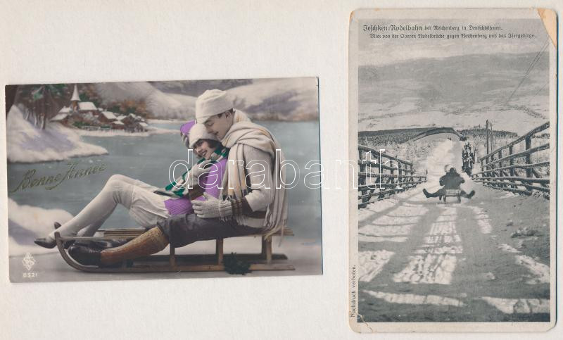4 db régi téli sport motívum képeslap: szánkózók / 4 pre-1945 winter s...