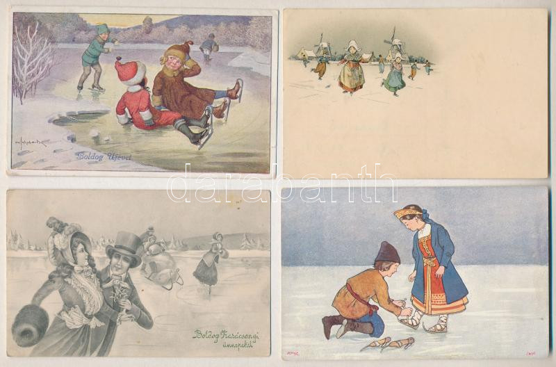 8 db régi téli sport motívum képeslap: jégkorcsolya, korcsolyázók / 8 pre-1945 winter sport motive postcards: ice skate