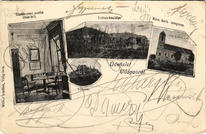 Description: 1907 Világos, Siria; Bohus kastély, várrom, Történelmi szoba 1849-ből, Római katolikus templom. Wéber János kiadása / castle, church, castle ruins, room interior. Art Nouveau (EB)