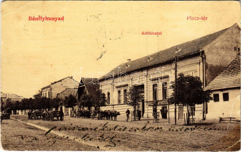 1908 Bánffyhunyad, Huedin; Piac tér, Adóhivatal, nyomda és könyvkötész...