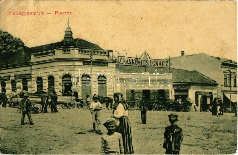 1908 Szilágysomlyó, Simleu Silvaniei; Piac tér, Rosenberger Ármin, Frankovits Ignác, Tompa Arthur üzlete, Lajos hengermalom liszt főraktára, italmérés, kocsma. W. L. (?) 2307. Kiadja Heimlich K. / market square, shops, rolling mill's flour warehouse, inn (Rb)