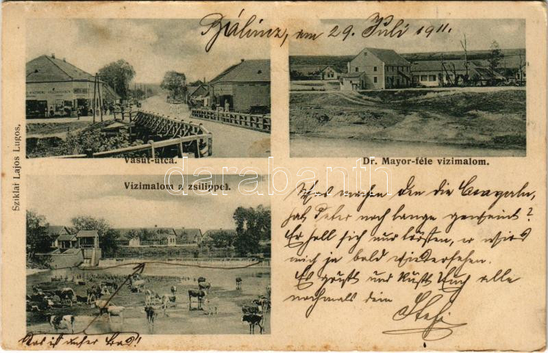 Description: 1911 Bálinc, Balint; Vasút utca, Vízimalom és zsilipek, Dr. Mayor-féle vízimalom, Margitai Ignác üzlete és saját kiadása / street, watermills, sluice, shop (Rb)