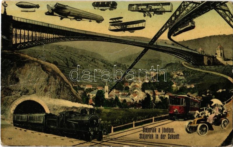 Description: 1913 Stájerlak, Steierlak, Stájerlakanina, Steierdorf, Anina; a jövőben montázslap. Kiadja Scheitzner Ignác 7475. / in der Zukunft / in the future montage postcard (EK)